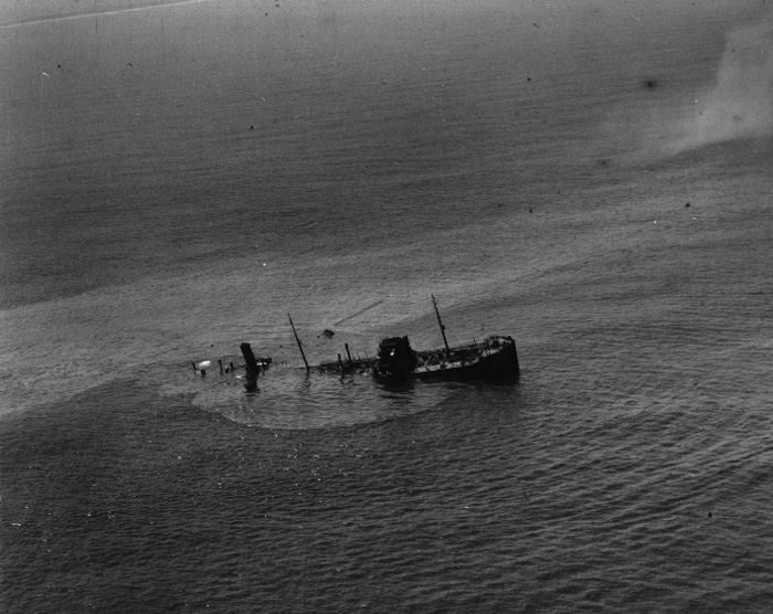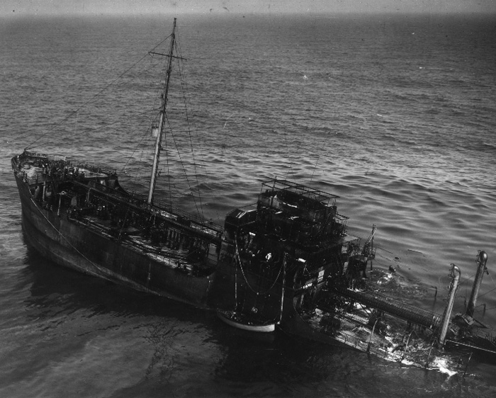 One the afternoon of May 25, 1942 von Kapitan Kelbling, submerged and fired a torpedo hittin the starboard side. The tanker's cargo began to burn and the Master gave orders to abandon ship. Persephone's crew was rescued by a Coast Guard patrol boat. The convoy escorts, supported by aircraft, counterattacked damaging the boat. The tanker's bow section was salvaged and towed to New York, where 21,000 of 80,000 barrels of oil were salvaged. Her midship house was removed intact and placed on the tanker Livingston Roe. A hazard to navigation jutting out of the 50 foot depths, she stern section was later blown up by the US Coast Guard. Locals boarded the abandoned wreckage making good use of piping and supplies.